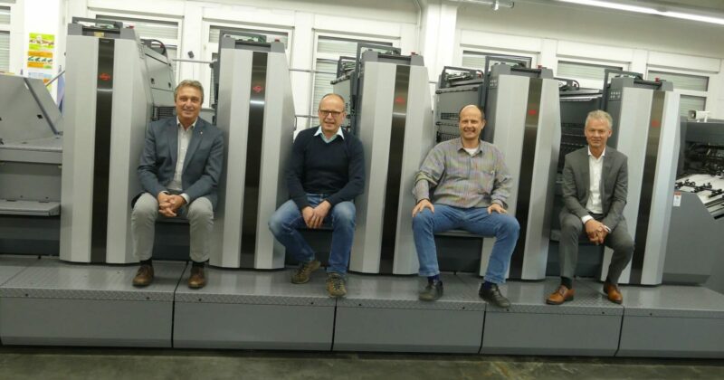 Von links: Heinrich Maag, Chromos-Group-Verkaufsleiter für RMGT-Offsetanlagen in der DACH-Region, die Geschäftsführer Johannes und Ernst Müller sowie Peter Reiter, Chromos-Group-Business-Development-Manager für RMGT/Ryobi, nach der Installation mit der RMGT 970.
