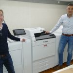 Elmar Müller (r.) zeigt Matthias Siegel (Grafische Palette) die jüngste Errungenschaft im Haus: die Fujifilm Revoria Press SC285S, die auch Gold und Silber druckt.