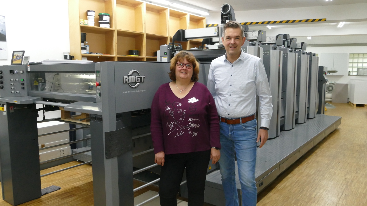 Vor ihrem Zugpferd für den Offsetdruck: Die Geschwister Elmar Müller (Geschäftsführer) und Claudia Wendt (Prokuristin) an der RMGT 925 LED-UV-Druckmaschine.