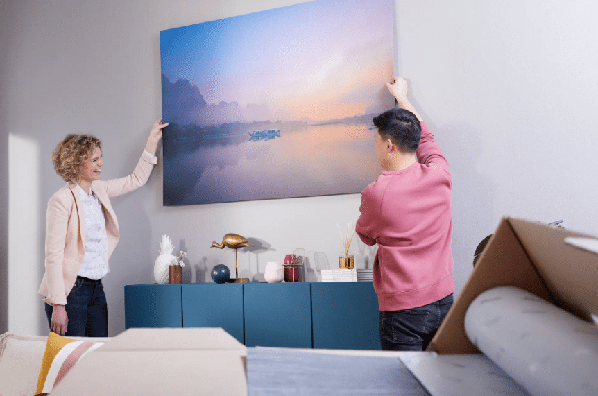 Die Idee hinter dem Quick2Wall-Konzept ist, ausgeklügeltes Design mit einfacher Handhabung zu kombinieren. Mithilfe des patentierten Hängesystems aus Steckrahmen werden gedruckte Bilder schnell und einfach an der Wand befestigt. Der sehr leichte Rahmen wird an der Rückseite des Bildes befestigt und ist durch die Verwendung eines speziellen Substrats vorn nicht sichtbar. Auf diese Weise wird ein 3D-Effekt erzeugt – das Bild scheint an der Wand zu schweben. Dafür sorgt auch die Spanntechnologie, welche die Bilder straff und flach hält.