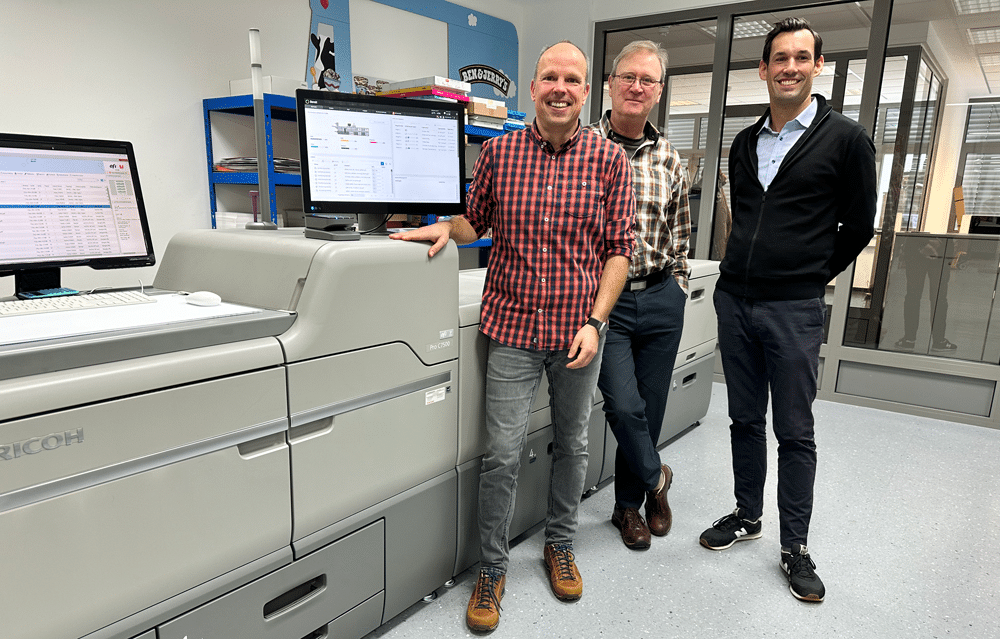 „Basis für die einfache und reibungslose Produktion mit der Ricoh Pro C7500 ist die komplett neu entwickelte Betriebssoftware Ricoh Graphic Communications Operating System (GC OS), mit der die Automatisierung ein neues Level erreicht“, erklärt Simon Fastenau. „Eine Media Identification Unit erkennt beispielsweise die Oberfläche des Papiers und stellt die notwendigen Parameter automatisch ein. Anschließend liefert die Maschine drei Testdrucke, von denen der Operator der Maschine den besten als OK meldet, und wiederum über das System weitere drei Testdrucke erhält, bis der Output zufriedenstellend ist. Dies alles erledigt die Ricoh Pro C7500 vollautomatisch.“ Auch kann der Operator über einen PC oder Tablet via Fernzugriff auf das System zugreifen, sodass reibungslose Betriebsabläufe unterstützt werden.