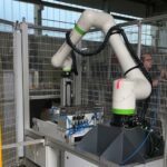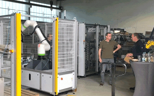 Die CTB-Lösung von palamides und Popp verfügt über einen Roboterarm, der Druckaufträge auf Paletten, Kartons oder WPC-Boxen ausliefern kann.