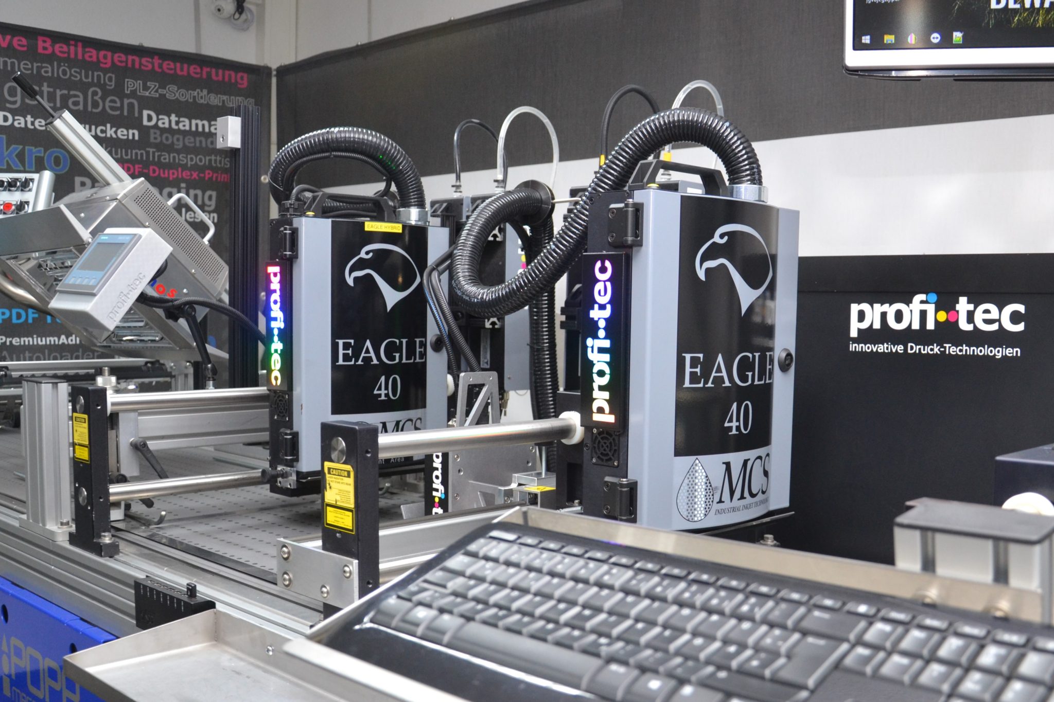 Auf Basis eines mobilen Vakuumdrucktisches von Popp Maschinenbau montierte profi-tec ihr Eagle 30 UV-Inkjetsystem und demonstrierte damit das Eindrucken variabler Daten auf von Horizon erstellte Broschüren. In der praktischen Anwendung werden auf diese Weise normalerweise Broschüren für den postalischen Versand mit Adressen versehen. Für die Ausstellung in Quickborn hatte man sich etwas Besonderes einfallen lassen: Die Logos der drei beteiligten Unternehmen Horizon, profi-tec und Popp wurden samt den Kontaktdaten der jeweiligen Ansprechpartner direkt auf die Broschüren gedruckt.