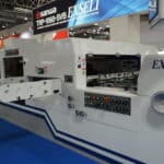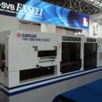 Martin Stroetges betonte dort die Vorzüge der Sanwa-Stanzen, insbesondere des vollausgestatteten Flaggschiff-Modells TRP-1060-SVB Exseli, das auf dem Messestand live vorgeführt wurde. Dabei handelt es sich um eine Maschine für Bogenformate bis 740 x 1.060 mm und einer Leistung von 9.000 Bö-gen pro Stunde: „Da wäre zunächst die kompakte Bauweise und der sehr ruhige, gleichmäßige und vibrationsarme Lauf“, so Stroetges. „Deshalb sind nur wenige Haltepunkte nötig.“ Die Maschine hat zudem ein patentiertes Stanzdruck-Ausgleichssystem (APC). Es reduziert die Rüstzeiten um bis zu 75 Prozent. Durch das APC werden Ausgleichsmesser überflüssig und die Lebensdauer der Stanzwerkzeuge steigt.