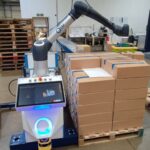 Ein Unipal bei der Arbeit. Das mobile Robotermodul ist hier beim Palettieren zu sehen. Das Bild entstand während einer Roadshow in Großbritannien.