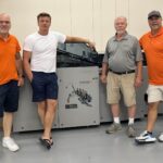 Von links: Das Team mit Sascha Schmidt vom Hohner-Vertrieb, Eduard Martin, Geschäftsführer der Schwabenprint GmbH und LLC, sowie Joe Koch und Rick Mann (beide Hohner USA) an der frisch in Betrieb genommenen Hohner Futura.