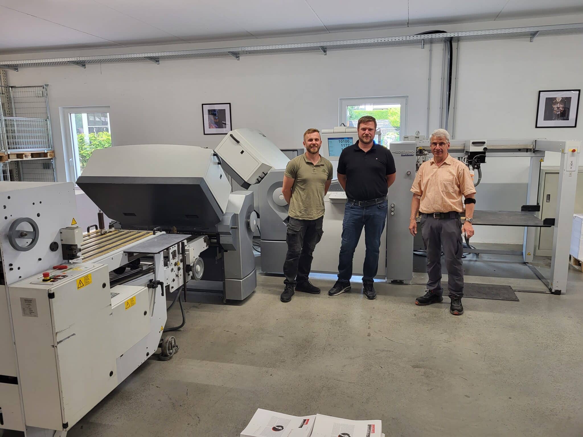 Die „neue“ gebrauchte Stahlfolder TH82 mit Palettenanleger PFH ersetzt bei Seltersdruck gleich zwei ältere Falzmaschinen. Im Bild (von links): Mario Peran (Buchbinder), Steffen Lehn (Geschäftsführer) und Gert Franz (Buchbinderei-Leiter).