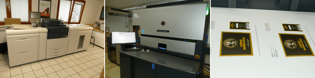 Seit November 2020 bei Uehlin: Die Xerox Versant 180 (oben) und die HP Indigo 7K, mit der man die Farbe Gold hervorragend imitieren kann.