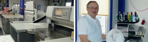 Bild links: Zwei Polar-Schneidanlagen N 92 XT wurden 2006 und 2011 über Heidelberg bei Schimmer Druck angeschafft. Bild rechts: Auch Textilien bearbeitet Schimmer Druck. Thomas Schimmer zeigt die Mehrkopfstickmaschine dazu.