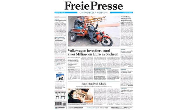 Die Freie Presse berichtet von Montag bis Samstag über Themen aus Chemnitz, Zwickau, Vogtland, dem Erzgebirge, Deutschland und der Welt. Die verkaufte Auflage im 1. Quartal 2018 beträgt 224.576 Exemplare, das sind 2,71 Prozent weniger als im Vorjahresquartal.