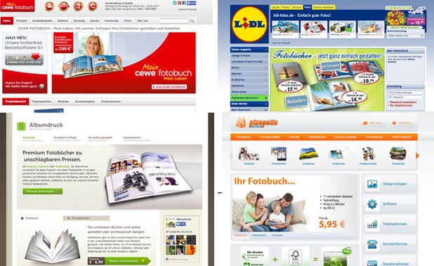 Das fotobuch-Portal Albumdruck.de steigt von Platz 10 (Stand 2012) auf Platz 7 und bietet nun Fotobücher in 23 verschiedenen Gestaltungsvarianten an. Diese können als Hard-, Softcover, mit Kunstleder- oder Leinencover, oder mit Ringbindung bestellt werden und sind in Formaten von 10 x 15 cm bis zu 30 x 40 cm und mit zahlreichen Hintergrundbildern und Designvorlagen erhältlich. Cewe- Fotobuch hält seinen 7. Platz genau wie im Jahr 2012. Der Kunde hat zwischen acht Formanten und sieben Einbänden die Auswahl. Ebenso kann zwischen mattem bzw. glänzendem Premiumpapier und belichtetem Fotopapier gewählt werden. Die Bestellung kann sowohl vom PC, Laptop bzw. Mac, als auch vom Tablet oder Smartphone aufgegeben werden. Discounter Lidl bietet auf seiner Website Fotobücher an, bei denen zwischen verschiedenen Designs, Layouts, Hintergrundsmöglichkeiten, Grafiken und Effekten gewählt werden kann. Über eine Software können diese mit Hard-, Soft-, Leinen- oder Filzcover bestellt werden. Eine dünne Variante ist hier mit einem Fotoheft mit Rückstichheftung möglich. Zusätzlich kann das Fotobuch mit einer Hochglanzveredelung versehen werden. Mit dem Angebot von Pixopolis kann der Kunde für sein Fotobuch aus 12 Formaten, drei Covermöglichkeiten und fünf Bindungen, darunter die Schraubenbindung, wählen. Zudem besteht die Möglichkeit, die Innenseiten des Umschlags individuell zu gestalten.