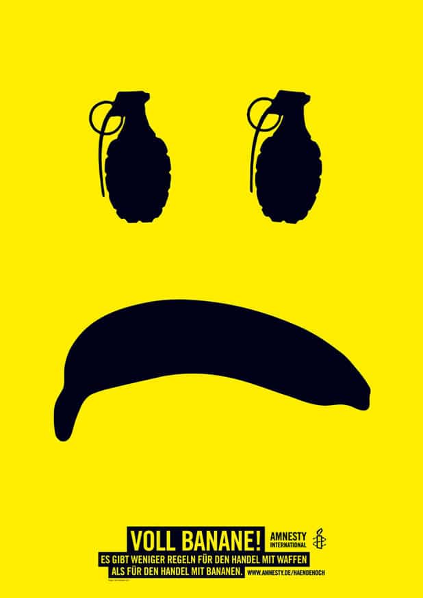 Plakat zu einer Aktion von Amnesty International zum Thema Waffenhandel. In der Aktion geht es darum, dass der Handel mit Waffen weniger gesetzlichen Restriktionen unterliegt als der Handel mit Bananen.