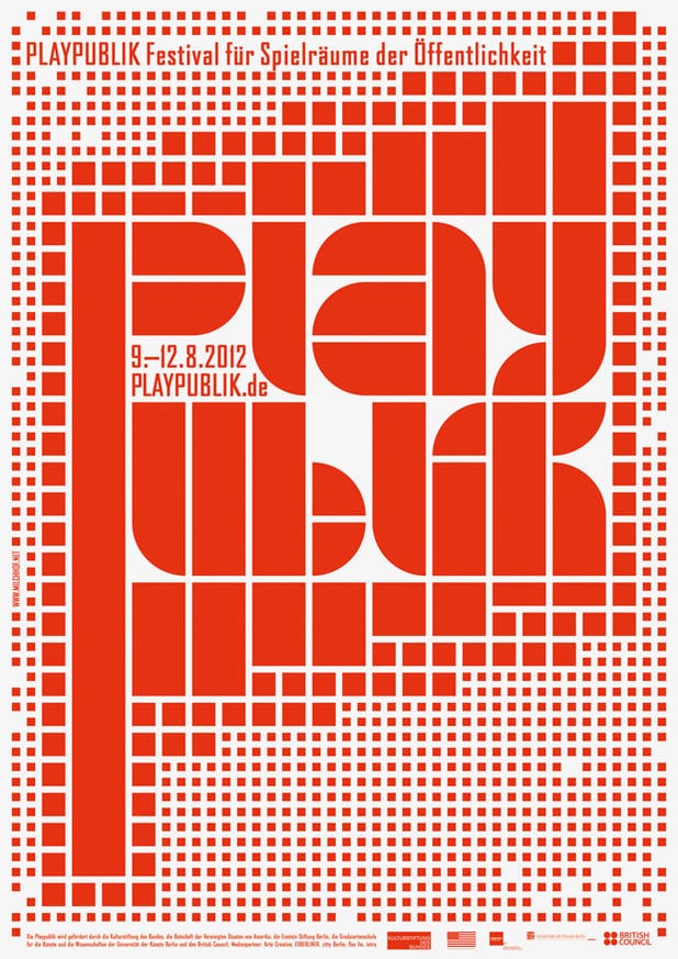 Im öffentlichen Raum (Karl-Marx-Allee, Berlin) wird die Playpublik (ein Festival für Spielräume) ausgerufen. Eine Anordnung aus analogen oder digitalen Blöcken bildet das Fahnenlogo.