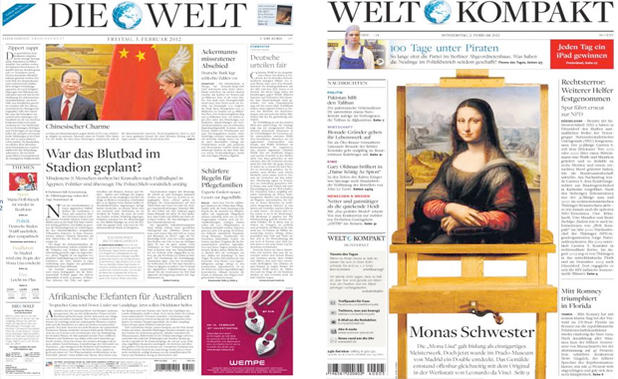 Die von der Axel Springer SE herausgegebene Zeitung "Die Welt" erscheint seit 1946 als überregionale Tageszeitung. Die verkaufte Auflage von "Die Welt" gemeinsam mit "Welt Kompakt" im 4. Quartal 2017 beträgt 169.529 Exemplare (IVW). Das ist ein Minus von 6,89 Prozent gegenüber dem 4. Quartal 2016 (182.079).