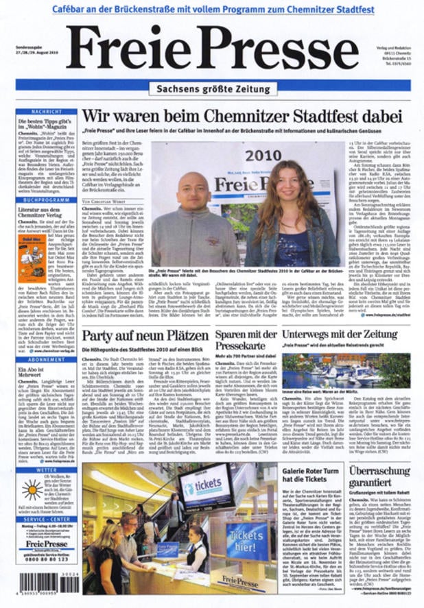 10.Platz: Die Freie Presse berichtet von Montag bis Samstag über Themen aus Chemnitz, Zwickau, Vogtland, dem Erzgebirge, Deutschland und der Welt. Die verkaufte Auflage im 2. Quartal 2011 beträgt 277.221 Exemplare, das sind 0,51 Prozent weniger als im Vorquartal.