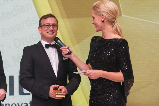 Nach dem Dinner wurde es spannend: die Druck&Medien Awards in den 25 verschiedenen Kategorien wurden verliehen. Moderiert wurde die Preisverleihung von der aus der Tagesschau bekannten Moderatorin Judith Rakers. Die "Stimme aus dem Off" war in diesem Jahr Martin Keßler, die deutsche Synchronstimme der Hollywood-Schauspieler Nicolas Cage und Vin Diesel. Bilder: Andreas Schwarz