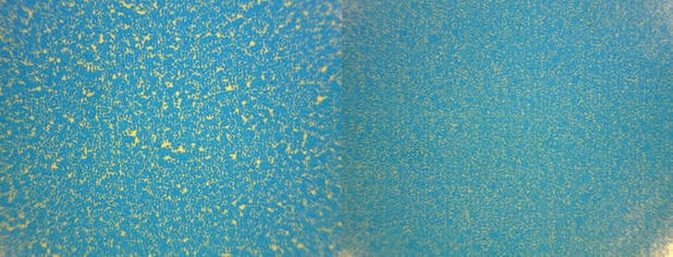 Ergebnisse: Links die fotopolymere Druckforn, rechts die elastomere Druckform. Getestetes Kriterium: Vollfläche.