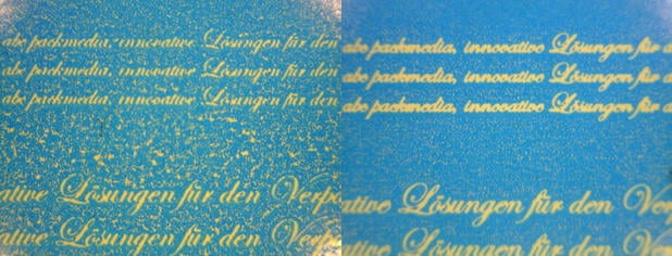 Links die fotopolymere Druckform, rechts die elastomere Druckform. Getestetes Kriterium: Feine Schrift negativ, 2/3 pt.