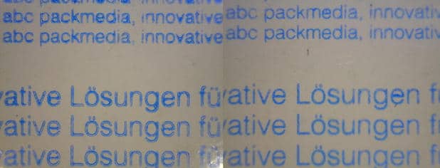 Links die fotopolymere Druckform, rechts die elastomere Druckform. Getestetes Kriterium: Feine Schrift positiv, 2/3 pt.