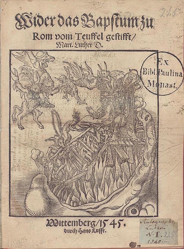 Gebrochene Schriften und Antiqua-Versalien: Jürgen Spitzmüller zeigte anhand der Titelseite von Martin Luthers „Wider das Bapstum“ (1545), wie im 16. Jahrhundert mittels Schriftwahl inhaltlich differenziert wurde. Das hier gezeigte Exemplar befindet sich in der Universitäts- und Landesbibliothek Münster.