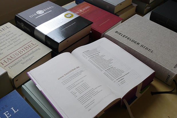 Schmökern oder forschen – wie soll die Bibel gestaltet sein? Michael Schlierbach brachte ältere und aktuelle Bibel-Ausgaben mit.