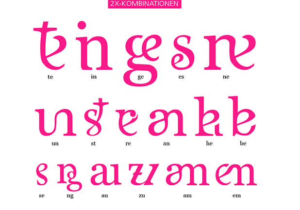 Experiment Platzersparnis: Lars Seekamp entwickelte das ästhetisch reizvolle Alphabet TYPSYN – hier verschmelzen die häufigsten Buchstaben-Zweier- und Dreierkombinationen zu einem neuen Zeichen.