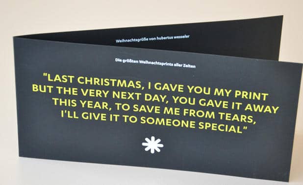 Auch wenn diese Karte auf den ersten Blick nicht unbedingt weihnachtlich wirkt – die originelle Abwandlung des Weihnachtsklassikers von Wham! und die Farbgebung ist schon einzigartig.