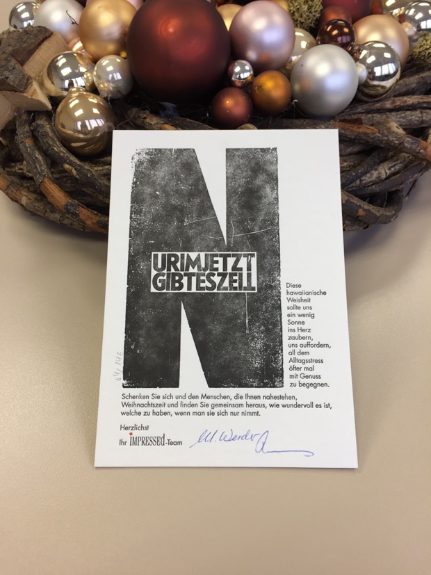 Diese im Letterpress handgefertigte Karte ziert die hawaiianische Weisheit: "Nur im Jetzt gibt es Zeit."