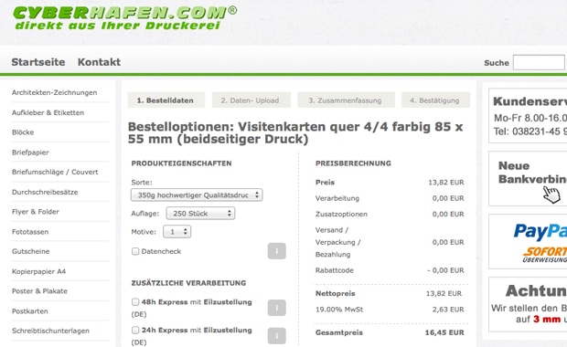 Die Druckerei "cyberhafen" sichert sich den vierten Platz in unserem Ranking. Das Angebot ist mit 16,45 Euro immer noch sehr günstig. Allerdings lässt das Paket dann etwas auf sich warten. Der Standardversand dauert sieben Werktage.