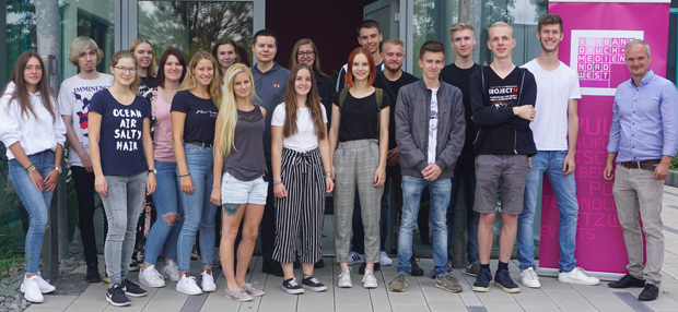 Kursstart am 5. August 2019 in Lünen: Die 18 Mediengestalter-Auszubildenden mit Kursleiter Tom Valk, Akademie Druck + Medien Nord-West (rechts).(Bild: VDMNW)