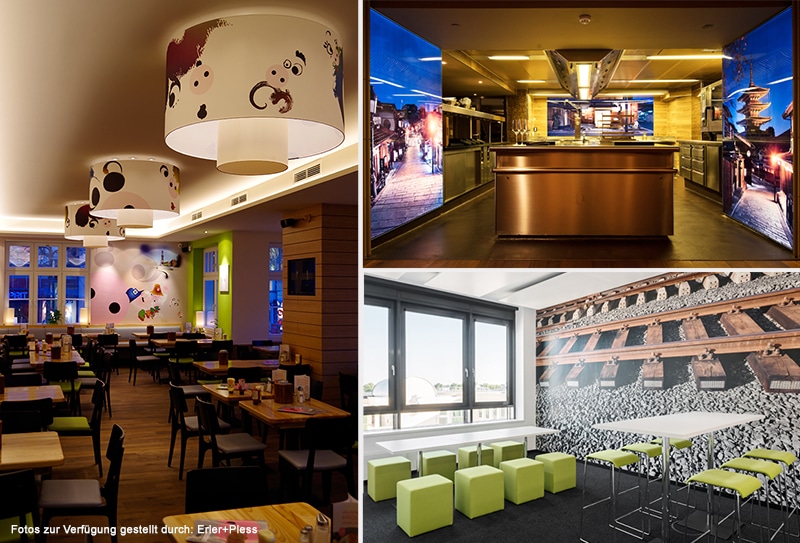 Die drei Projekte haben die Druck&Medien-Awards-Jury überzeugt: Die Wandgestaltung in der neuen Euopazentrale der Deutschen Bahn in Berlin (unten rechts), die Neugestaltung der Altonaer Filiale der Schweiske Restaurants (Bild links) und das Innenraumdesign mit Backlit-Dias im Restaurant Nikkei Nine (Bild oben rechts).(Bild: Erler+Pless)