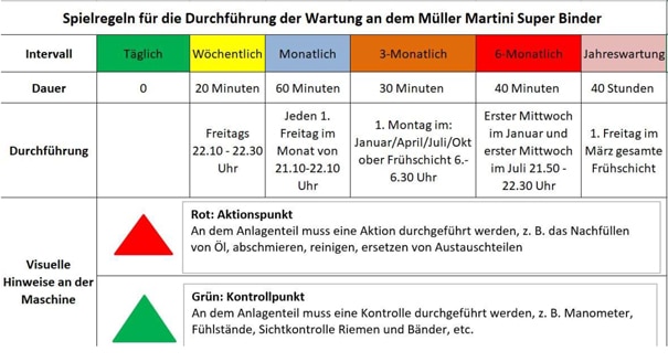 Basis dieser autonomen Instandhaltung ist ein recht simpler Wartungsplan, bei dem verschiedene Farben das jeweilige Wartungsintervall markieren. Damit diese Wartungsintervalle und -arbeiten auch wirklich durchgeführt werden und nicht ständig „auf morgen“ verschoben werden, gibt es quasi als Dreingabe Spielregeln, die genau festlegen, wann welche Arbeiten erledigt werden sollen – und wie lange sie dauern.