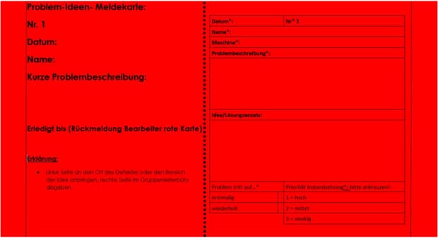 Entscheidend ist es, den Mitarbeitern auch Gehör zu verschaffen – sei es bei technischen oder organisatorischen Problemen, sei es bei Ideen zur Prozessverbesserung. Hierfür empfiehlt Lehmann zweigeteilte rote Ideen-Meldekarten. Die linke Seite, auf der das Problem kurz umrissen wird, verbleibt an dem Ort, an dem das Problem auftrat und ist somit an dieser Stelle ersichtlich. Die rechte Hälfte der Karte geht – ebenfalls mit Problembeschreibung und möglichem Lösungsansatz – in ein Prozesskörbchen, mit dem sich dann Betriebs- oder Schichtleiter beschäftigen. Wichtig ist nur, dass die Vorschläge nicht im Nirvana verschwinden.