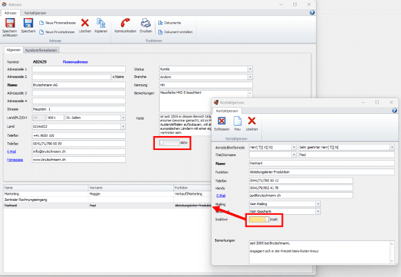 Für zielgerichtete Mailings und eine vereinfachte Auftragsanlage können ehemalige Kunden, Lieferanten gesondert gezeichnet werden. Diese sind zwar noch in den bestehenden Aufträgen verfügbar, werden jedoch für die Auftragsanlage und Mailings nicht mehr berücksichtigt. Diese Funktion ist auch auf Ebene der Kontaktpersonen verfügbar, die in einer beliebigen Anzahl zu den Adressen erfasst werden können. In diesem Zusammenhang wurde auch die Auftragssuche mit zusätzlichen Feldern erweitert.
