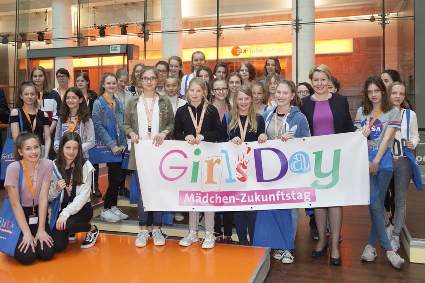 Beim Aktionstag Girl's Day geht es in erster Linie darum, Geschlechterklischees in der Berufsbildung aufzubrechen. Im Bild: Die Teilnehmerinnen 2018 zusammen mit der Bundesfamilienministerin Dr. Franziska Giffey.