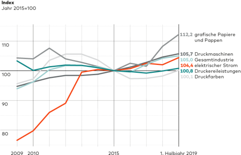 Auch der Preisanstieg bei grafischen Papieren hielt an, allerdings weniger dynamisch als noch im Vorjahreshalbjahr. So legten die Erzeugerpreise für grafische Papiere (ohne Zeitungsdruckpapier) im Vergleich zum ersten Halbjahr 2018 um durchschnittlich 5,2 Prozent zu und die Zeitungsdruckpapierpreise um durchschnittlich 9,2 Prozent. Als Reaktion auf diese Papierpreissteigerungen erhöhten sich die Verkaufspreise für Druckereileistungen. Das Plus im ersten Halbjahr 2019 betrug im Mittel 1,3 Prozent. Die Preise für Druckerzeugnisse steigen somit seit mittlerweile 18 Monaten.