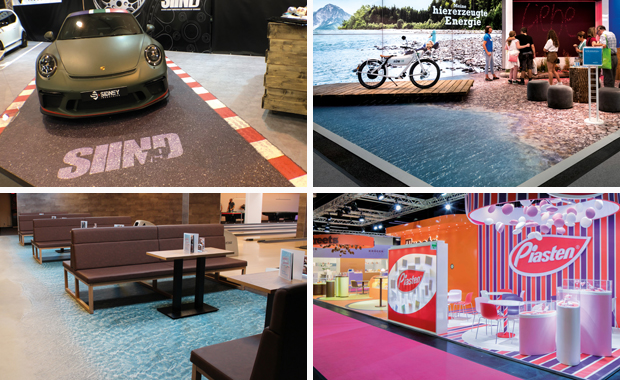 Fotoböden können an den unterschiedlichsten Orten eingesetzt werden: So bringt er beispielsweise die Rennstrecke auf den Messestand (l.o.) oder ein Naturpanorama, das die Wandgestaltung mit aufgreift (r.o.). Er bringt Standfeeling in Bowling Center (l.u.) oder lockt über seine farbenfrohe Gestaltung die Besucher zu bestimmten Ständen.(Bild: zur Verfügung gestellt durch Fotoboden.de)
