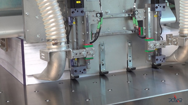 Die DC-12 Rapid verfügt über weitere Automatisierungskomponenten, unter anderem ein System zur automatischen Beschickung von Schneidlagen, einen Schneidautomaten zum voll- automatischen Zuschneiden von Streifen sowie am Ende des Workflows eine Sortier- und Packstation, die einzelne Bündel per Roboter greift, dreht und sortiert in der Station ablegt. Das ansonsten üblicherweise manuelle Konfektionieren von 24 Etikettenbündeln pro Minute übernimmt ein Roboter. Auch hier geht es laut Polar unter anderm darum, den Bediener körperlich zu entlasten.