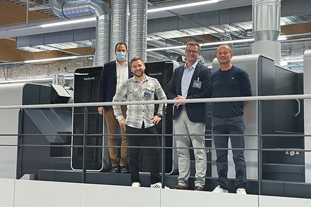 Das Team von Burger Druck mit Geschäftsführer Dirk Burger (2.v.r.) an einer Rapida 106 im neuen CEC von Koenig & Bauer. Bald wird so eine Maschine auch im Breisgau produzieren. (Bild: Koenig & Bauer)