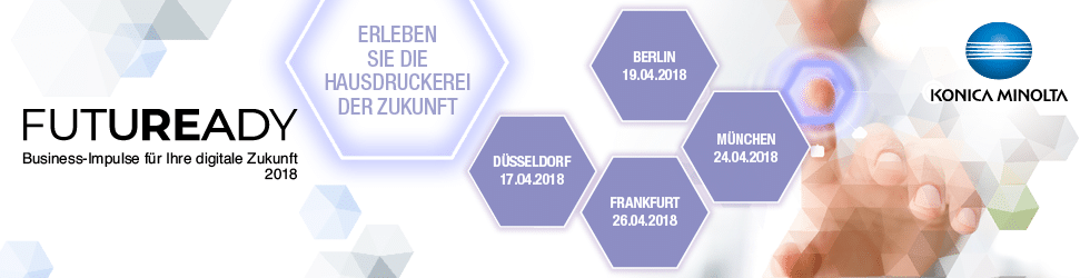 Im Rahmen seiner FUTUREADY Roadshow präsentiert Konica Minolta digitale Technologien für sämtliche Bereiche eines Unternehmens. Ein besonderer Bereich seiner Ausstellung ist die zentrale Inhouse Produktion.Hausdruckereien haben Zukunft: Über variablen Datendruck, automatisierte Workflows und interne Web-to-Print-Anbindung schaffen sie Business-Mehrwerte für Unternehmen. Auf der FUTUREADY-Tour 2018 zeigen Experten von Konica Minolta, wie Hausdruckereien ihre Produktivität steigern können und Geschäftsprozesse optimieren. Live-Demonstrationen und Fachvorträge hierzu finden an den Tour-StandortenDüsseldorf (17.04.), Berlin (19.04.), München (24.04.) und Frankfurt (26.04.) statt. Interessierte sind herzlich eingeladen an einer der Veranstaltungen teilzunehmen.