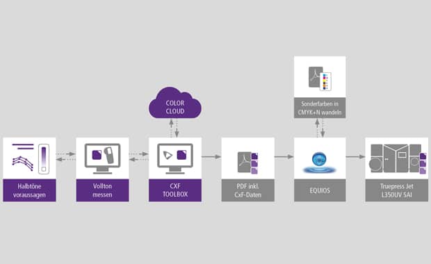 Ab dem Frühjahr 2021 soll dann Screens neuer UV-Inkjetdrucker,Truepress Jet L350UV SAI, die mit CxF-Daten angereicherten PDFs empfangen und mithilfe der Farbmanagement-Software von CGS Oris für den Mehrkanaldruck in sechs Farben separieren können, sodass Sonderfarben auch mit einer erweiterten fixen Farbpalette einfach und präzise gedruckt werden können.