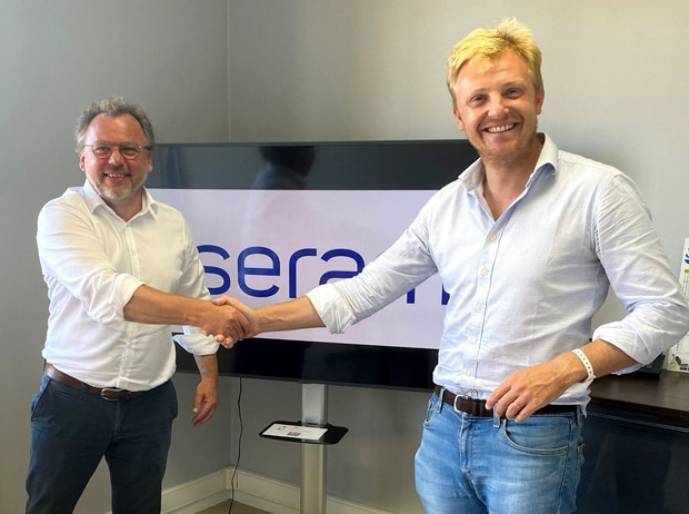 Klaus Sedlmayr (links), Geschäftsführer der Chromos GmbH, und Charles Dernoncourt, CEO von Serame, besiegeln die Zusammenarbeit der beiden Unternehmen per Handschlag.(Bild: Chromos)