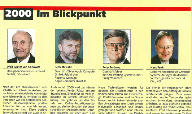 Der Jahrtausendwechsel war vollzogen, der global befürchtete Computercrash war ausgeblieben, Gutenberg war Mann des Jahrtausends, „Millenium“ das Wort des Jahres 1999 und die Drupa 2000 stand als Branchengroßereignis vor der Tür. Die deutsche Druckindustrie war optimistisch und investitionsfreudig. Deutscher Drucker hatte Branchenexperten nach ihren Prognosen gefragt.