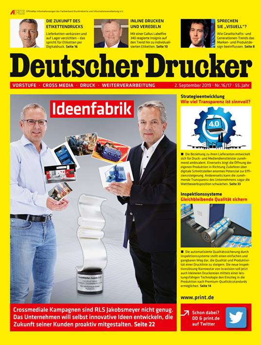Deutscher Drucker, Ausgabe 16-17/2019 ist ab sofort als gedrucktes Heft oder als digitale Ausgabe im print.de-Shop verfügbar.