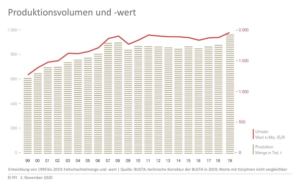 Die Entwicklung von 1999-2019: Produktionsvolumen und -wert.(Bild: Fachverband Faltschachtel-Industrie e.V. (FFI))