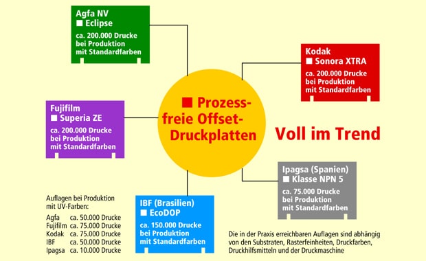 In Gesprächen mit Platten- und Druckmaschinen-Herstellern hat print.de versucht, Fragen nach der Markt- und Preisentwicklung sowie dem Entschichtungsverhalten und der Standfestigkeit prozessfreier Platten in den Druckmaschinen zu klären. Neben den »drei großen Playern« am Markt – Agfa, Fujifilm und Kodak – wurden auch der brasilianische Hersteller IBF (Indústria Brasileira de Filmes) und die spanische Agfa-Tochter Ipagsa befragt. Beide Hersteller sind seit Jahren auf dem deutschen Markt aktiv und haben neben den thermischen auch UV-Platten im Angebot.