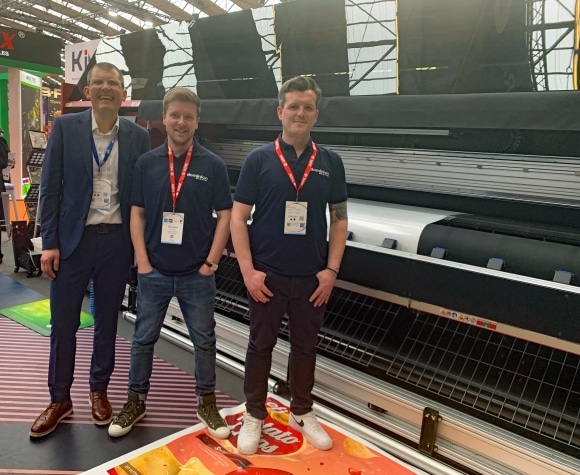Zufriedene Kunden am Fespa-Stand von EFI (v. r.): Byron Fox (Production Planning & Finishing Manager) und Chris Brien (Print Manager), beide von Dominion Print, mit Graham Megilley (Sales Development Manager bei EFI).(Bild: Deutscher Drucker )