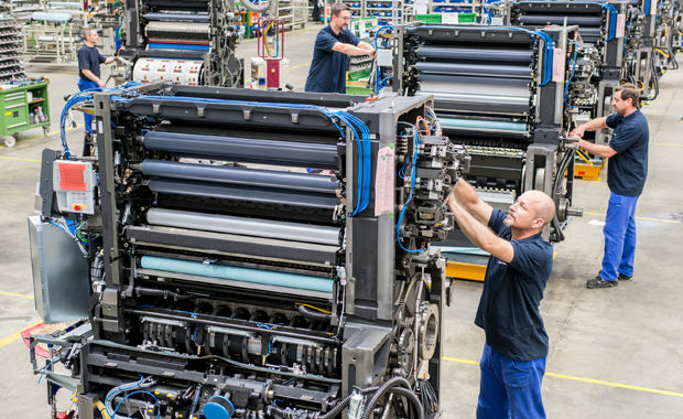 Blick in eine Bogenoffsetdruckmaschinen-Montagehalle.