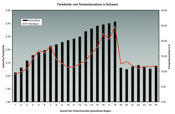 Extreme Schwankungen bei der densitometrischen Auswertung von Volltondichte und Tonwertzunahme im Druckwerk Schwarz.