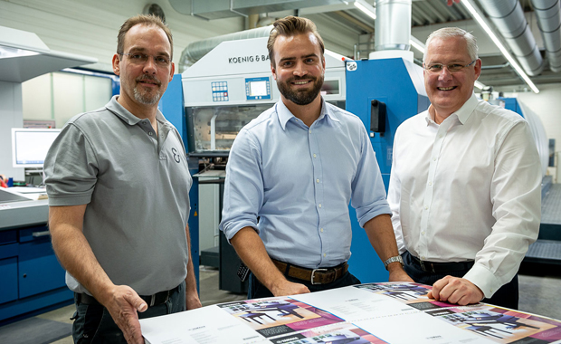 Vor der neuen Rapida 106 (v.l.n.r.): Drucker Dirk Beckmann, Geschäftsführer Mark Siepmann und Ralf Engelhardt von Koenig & Bauer.(Bild: Koenig & Bauer AG)